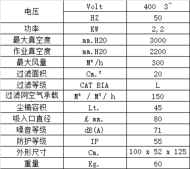 星形聚酯纖維過濾網裝在鋼制過濾艙中,過濾面積20000 cm2,過濾精度 高達3微米 L級別。手動振塵器通過上下垂直搖動能夠振落附著在濾網上的大部分灰塵,有效清潔過濾網從而保持正常的吸塵功效和延長濾網使用壽命。模壓鋁制吸塵口直徑為Ø80 mm,位于過濾網下面,能夠同時吸塵、吸固體和吸水(水量不得超過塵桶容量),無需更換或取出過濾網。