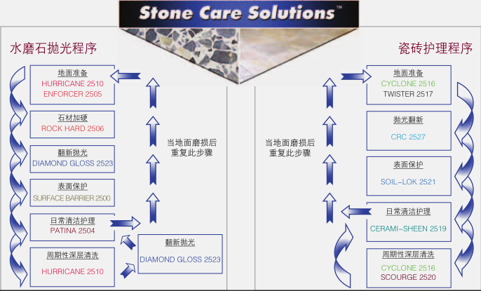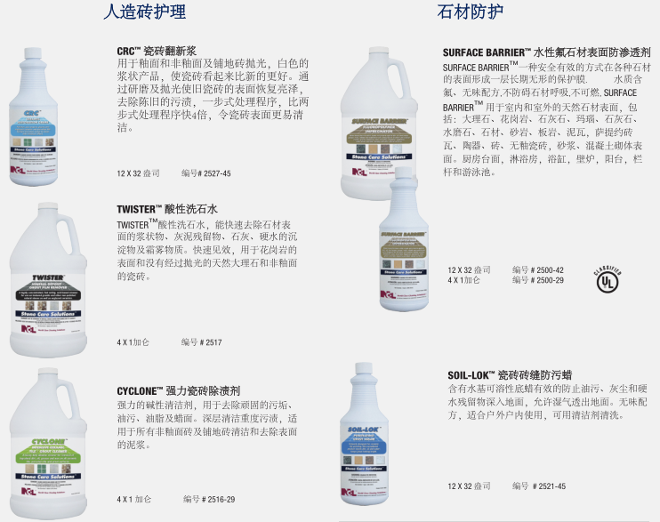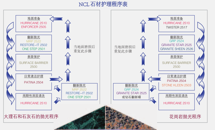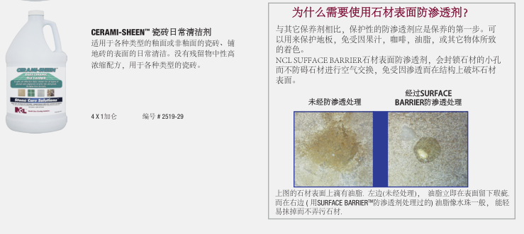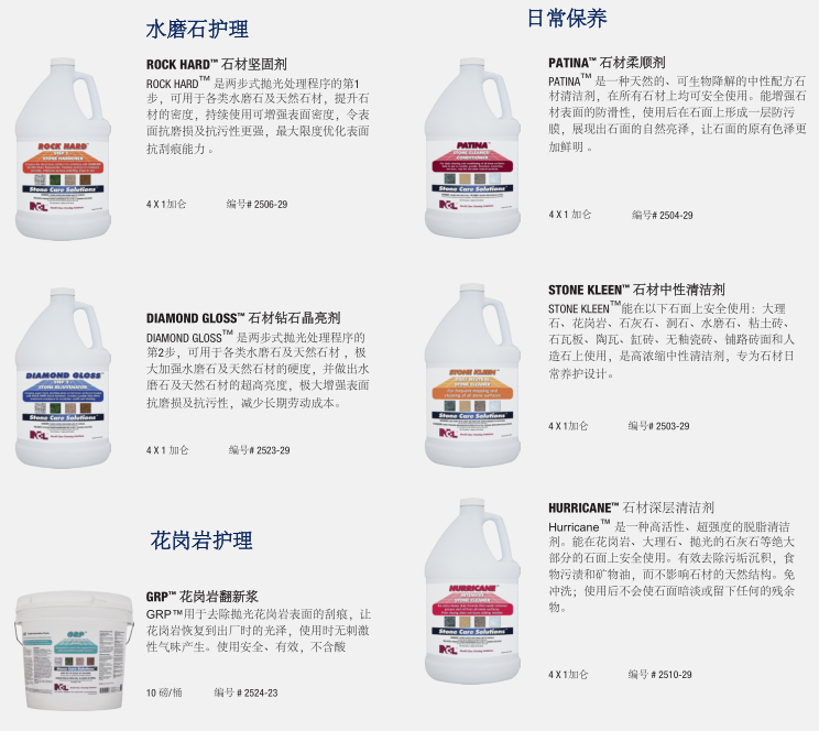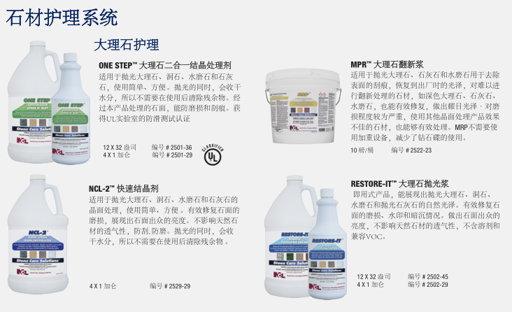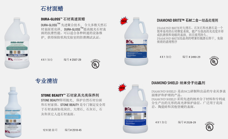 NCL的石材護理系統™對天然石材和陶瓷表面光澤的保持維護和修復是一個完整的、專業的系統。這種協調的系統在保持和修復天然石材地面,臺面保持高光澤度的同時防止表面的污漬侵蝕。50多年來NCL 生產了衛生維護專業人士信任的高質量以及高性能的產品。在NCL,我們所有的創新的產品和杰出表現的系統設計的發展方向是節省您的時間,勞動強度和費用。石材護理系統™為您提供任何天然石材或瓷磚表面高性能安全,專用維護產品。這個全面的計劃是專為建筑服務承包商和內部設施服務提供商設計,并不需要多年的技術經驗與研磨方法!