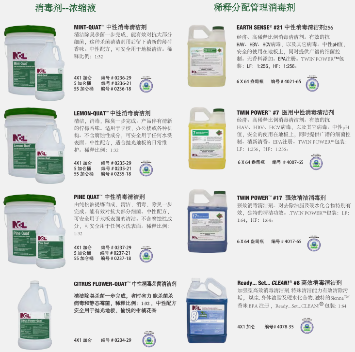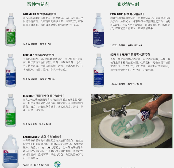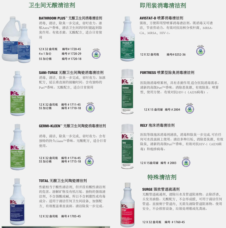 干凈、衛(wèi)生的衛(wèi)生間反映了設(shè)施的整體清潔程度。NCL的衛(wèi)生間清潔系統(tǒng)提供了最先進的清潔、消毒和除臭產(chǎn)品,以確保最大功效的控制衛(wèi)生間環(huán)境中致病細(xì)菌。對于地板,墻壁,和其他表面,你也會找到一個更完整的程序。健康 經(jīng)濟 的清洗方案可以選擇適合清潔人員使用的化學(xué)輸送系統(tǒng)。低成本的傳統(tǒng)包裝提供最大的靈活性。稀釋控制管理系統(tǒng)提供稀釋狀態(tài)下各種各樣的產(chǎn)品,以達(dá)到最佳效果。