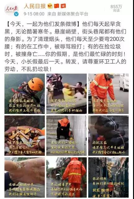 【今天,一起為他們發(fā)條微博】他們每天起早貪黑,無論酷暑寒冬。懸崖峭壁,街頭巷尾都有他們的身影。為了清理煙頭,他們每天至少要彎200次腰;有的在工作中,被辱罵毆打;有的在撿垃圾時,被撞身亡……你的假期,是他們最忙碌的時刻!放假期間轉(zhuǎn)發(fā),請尊重環(huán)衛(wèi)工人的勞動,不亂扔垃圾!